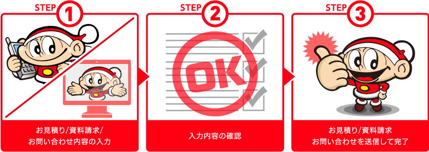 お電話もしくはフォームからお見積り・資料請求・お問い合わせ頂けます。後ほど担当者が対応させて頂きます。